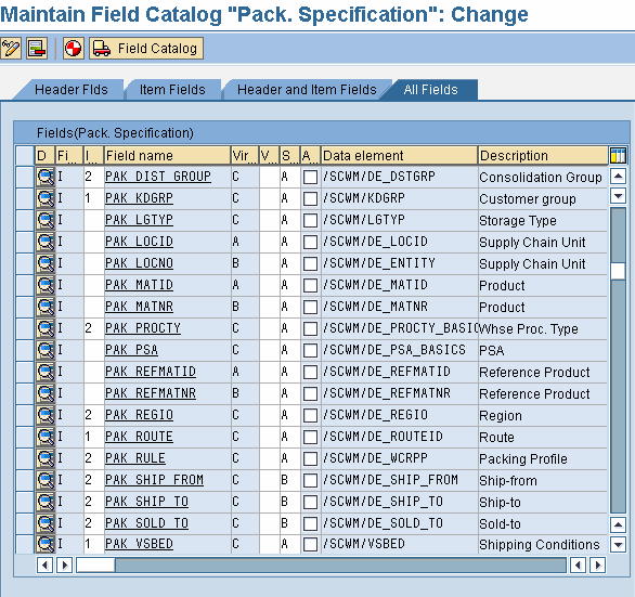 Note that you can add new packaging specification records with corresponding group numbers, range of rounding quantities, and status. The standard SAP system offers the field catalog shown in Figure 4 to maintain the condition tables, which you can enhance with custom fields. Follow IMG menu path SCM Basis > Pack > Packaging Specification > Determination of Packaging Specification > Create Field Catalog.