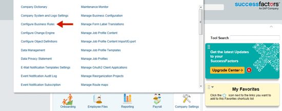 There are several standard rules that come with Employee Central. To see the delivered rules within the environment, go to Administration Tools, Company Settings, and then Configure Business Rules.