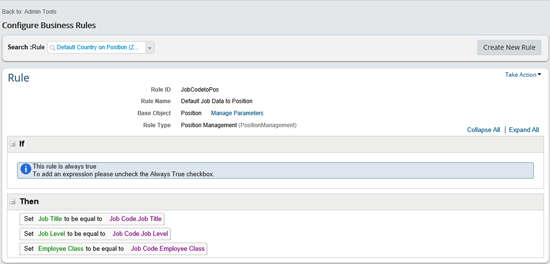 The Then section contains the actual logic and rules on what the rule will accomplish. For example, update key fields on an employee’s record (as shown in Figure 2) based on related objects and fields. The rule Pos2Job is showing that the Position Location, Position Business Unit, Position Division, Position Job Classification, Position Job Title, Position Cost Center, and Position Pay Grade fields automatically default to the equivalent fields on the employee’s record (within the Job Information portlet).