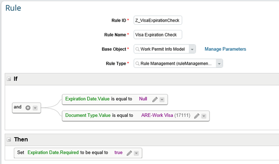 Another common use for leveraging the rules engine for employee data is when implementations choose to override the base configuration for field characteristics. Some examples of different field characteristics are configuring fields to be required, optional, hidden, or read only. This can be especially valuable when companies want to create conditional fields to be required based on a different field on the portlet. For example, in the Work Permit portlet in Employee Central, a company may want the Expiration Date Value field to be optional within the system configuration. However, as an exception, a company may want this field to be required for a given country if a certain work permit is chosen for a visa. Figure 7 shows how to write a rule to accomplish this. With this example, the Expiration Date Value field is required when employees with ARE-Work Visa (e.g., United Arab Emirates visas) work permits are selected.