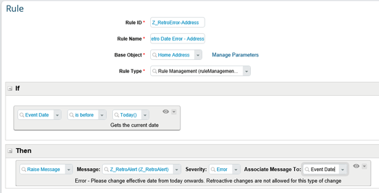 As mentioned previously, another way that the rules engine is used within Employee Central is to provide functionality for an implementation to do additional company-specific pop-up messages and alerts or provide validations. This functionality is especially useful when a company wants to create a warning or error message when certain conditions are met. Regarding validations, a common use case is when a company wants to prevent a user from doing a retroactive change on an employee’s address. To do this, a rule could be created to evaluate if the effective date of the change is before the system’s date (Figure 8). If the rule is deemed true, an error pop-up would then come up to instruct the user to change the effective date to be dated with a current or future date. The pop-up alert would also prevent the user from saving the new date until the conditions are met.