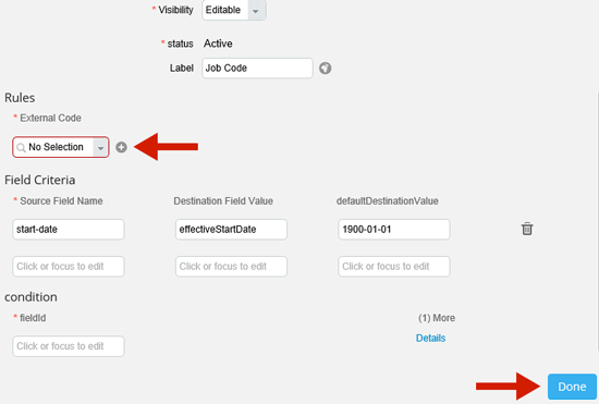 Step 5. In edit mode (Figure D), click the Details link by the field that should trigger the JobCodetoPos rule (in this case, it’s the jobCode field). Once you click the details link, the Details screen in Figure E appears.
