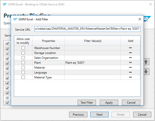 After that, you can set up filters against this entity set. Click the Add Filter button and choose one of the available filtering fields. In this example service, Plant is used to filter the MaterialSet (Figure 2). Under the Add column you can set up the values you want to include in the filter, such as my Plant SG01.