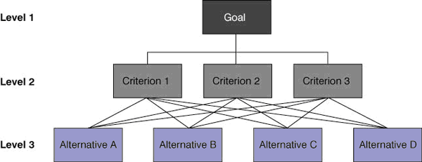 - AHP breaks down or decomposes the decision problem into a hierarchy of levels: level 1 is the goal; level 2 contains the criteria; intermediate levels represent sub-criteria (if needed); and the lowest level of the hierarchy (in this case, level 3) includes the alternatives.
