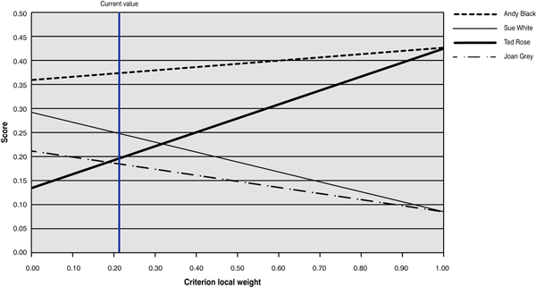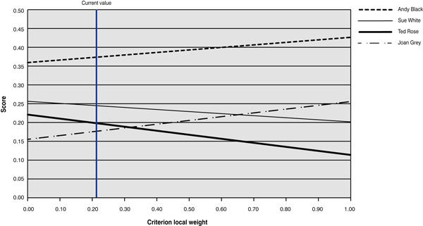According to Figure 10, if the weight of the personal/interpersonal skills criterion changed from 0.2319 to 0.3000, Joan Gray would be preferable to Ted Rose. When you analyze all of the criteria in that way, the score of the best candidate, Andy Black, has a strong basis (meaning that changing the criteria weights across a wide range would not influence the first position in the ranking), while the other candidates’ ranking positions are weaker (small changes in criteria weights may change their ranking). Therefore, the decision maker can conclude that his or her choice of the best candidate for the project manager position, Andy Black, is based on a strong and objective foundation.