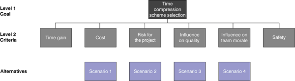 Of the two techniques, crashing is preferable. AHP can help you resolve the decision problem of whether a crashing or fast-tracking scheme is better in a given situation. Most people consider only time and cost when choosing the time-compression scheme. However, you should also consider other criteria, such as project quality and team morale. Figure 11 presents the proposed decision hierarchy for this example.