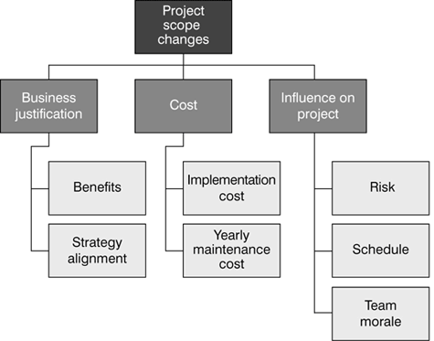 I have never seen a completed SAP project that had no unforeseen changes to its scope. You usually define the project scope early in the planning phase, so many reasons crop up to change it later: New internal requirements, changing legal requirements, and fluctuating external market conditions may alter the nature of the project as it progresses. An experienced project manager should give top priority to scope management because scope changes generate additional costs and schedule changes. This may affect the project’s critical path, and team morale will fluctuate accordingly (more unplanned work equals less motivation). Even though they are very large, SAP projects still tend to have limited budgets; therefore, you probably cannot approved all of the proposed changes. How do you decide which changes to approve and which to reject? You can find the answer by ranking the changes and approving those with the highest scores until the scope falls within the budget limits. Figure 12 presents a proposed problem hierarchy for project scope changes.