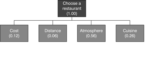 Being equally weighted, each one of the four criteria makes up one quarter of the whole; that is, each is 0.25 of 1.0. For example, suppose that the third criterion, atmosphere, has two sub-criteria. They are weighted at 0.125 each because they add up to the total value (0.25) of that particular criterion. Similarly, the fourth criterion, cuisine, has four sub-criteria, which add up to the total weight of that criterion (4 × 0.0625 = 0.25). You can expand this structure to any depth you want.