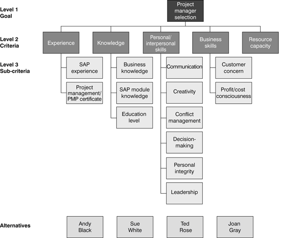 Now that you understand some of the basic concepts of AHP, let’s look at how to apply them in the real world of an SAP implementation by analyzing a typical problem of a new project: selecting a project manager. For this example, I drill down to show how AHP can help to clarify this complex process, and I introduce a few new concepts as well.