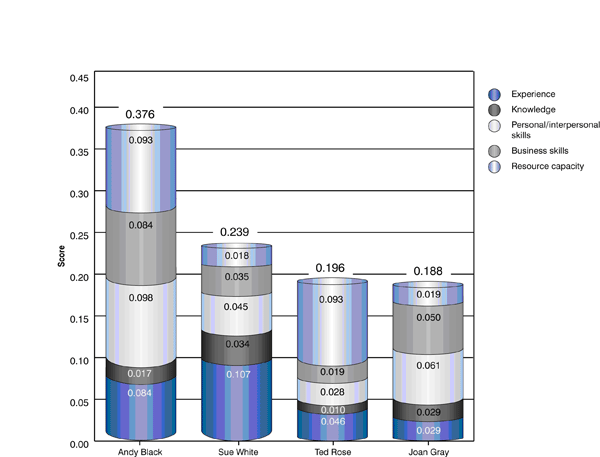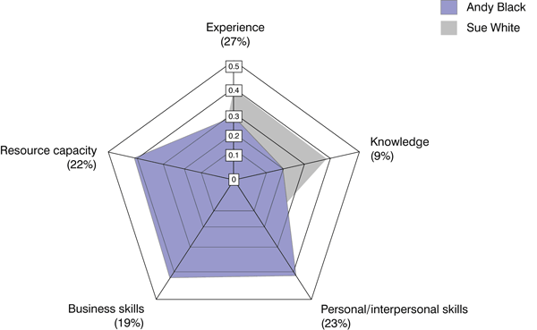 Figure 8 is a spider (or radar) diagram that compares the final priorities of the two candidates with the best scores, Andy Black and Sue White. The chart shows that Andy Black is definitely the better candidate from the perspectives of resource capacity, business skills, and personal/interpersonal skills. Such diagrams are useful visual tools that can help you to determine the differences between the alternatives you are comparing.