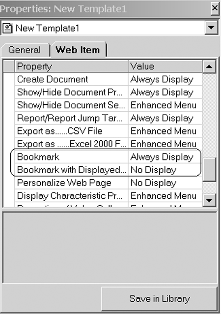 In its default state, the entry for Bookmark is enabled and Bookmark with Displayed Data is disabled. You can disable the bookmark entries. It is possible to display these menu entries in either the Basic or Enhanced section of the context menu. If you publish your query through the BW default query template, a toolbar button for the bookmark is included. When you bookmark a BW Web template, a URL that saves the navigational state of the query is created on the Web Application Server (Web AS). After the URL is generated, you can use the browser’s bookmark menu to add it to your favorites.