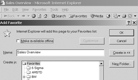 The AddToFavorites function creates the URL in a child window first. After the URL is generated, the browser’s bookmark functionality is invoked. Once the toolbar bookmark button is selected (Figure 4), the Add Favorite window appears (Figure 5). The name of the query is used as the default name for the bookmark.