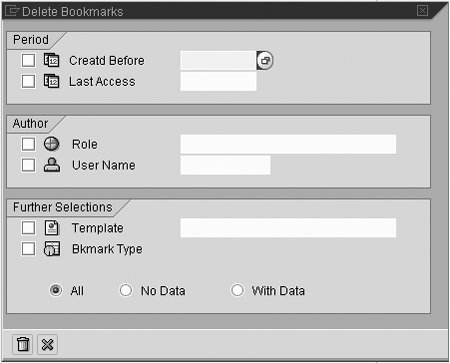 Users can remove the bookmark entry from their PC browser favorites. However, the BW URL on the server remains on the Web AS. Removing the BW bookmark from the Web AS requires Reporting Agent. Reporting Agent organizes the bookmarks based on the users and Web templates. It is possible to delete the bookmarks based on user name, template name, and other criteria (Figure 6). If you delete the BW bookmark from the Web AS first, be sure to remove the bookmark from the PC’s browser favorites as well.