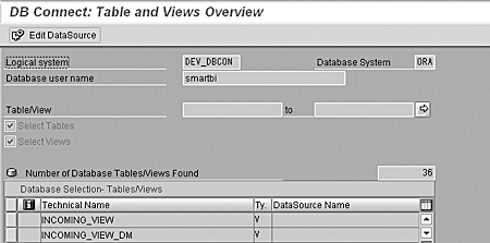 After you select the option Select Database Tables, the system directs you to select the tables/views from the object catalog on the external database, as shown in Figure 9.