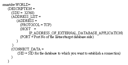 The database administrator of the external application provides the user name, password, and connection information. You put the connection information into a file called tnsnames.ora on the Oracle database server on the BW side. The connection information details are shown in Figure 5. You can use an editor to edit the file. The main parameter values in this connection information are the IP address of your external application and port number. The database administrator of the BW system makes those entries in the file. The administrator of the external database provides all the required parameters (e.g., the IP address of the external database, port, and surrogate ID [SID] for the database).