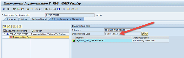 In the Implementing Class field, enter the name of the custom class as shown in Figure 8. Double-click the name of the Implementing Class and implement your custom logic in the VERIFY method by clicking the Method name. The VERIFY method is present in the interface IF_GRAC_TRG_VERIF that we implemented in the custom class Z_TRG_VERIF. Double-clicking the VERIFY method takes you to the ABAP editor where you can write your custom ABAP code. In this example, we called a Remote Function Call (RFC) created in the training system, which returns a success message if the training has been done.