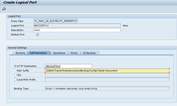 In the initial screen that appears, go to the General Settings section and click the Call Parameters tab (Figure 10). Enter data in HTTP Destination and Path Suffix fields as shown in the screenrprint. The HTTP Destination has to be the connector, and the Path Suffix is the custom web service created in the training system to verify training requirements. The training system is the system for which we created a connection in Figure 3. The web service is created in the training system or is available by standard in the training system depending on the type of training system.