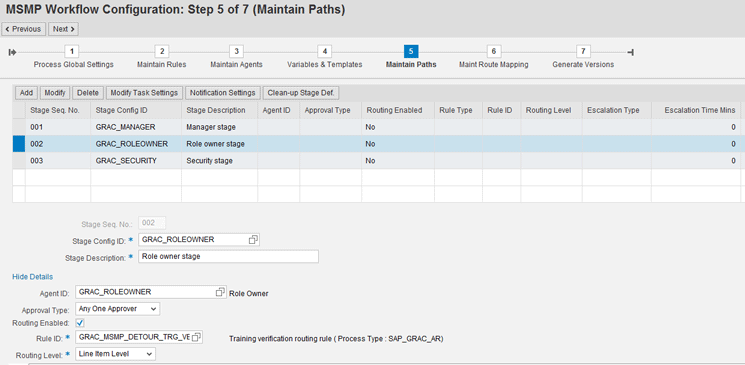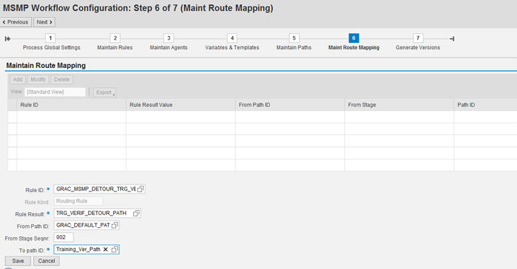 The detour path needs to be specified in the Maintain Route Mapping step of the MSMP workflow configuration as shown in Figure 14. To do this you need to open the MSMP workflow configuration page by following menu path SPRO > Governance, Risk and Compliance > Access Control > Workflow for access control > Maintain MSMP workflows.