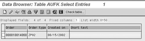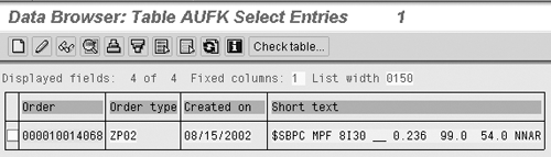 The second place is table AUFK. This is the CO module’s copy of the production order’s header data. Figure 1 shows an example entry. Notice that the field called Short text is blank. This may cause you to wonder why SAP bothered to put a field in this table if no text is actually stored there. However, this blank value phenomenon is only the case for orders that originate in the PP module. Texts are always stored in this field when orders originate in the CO module (i.e., the internal order).