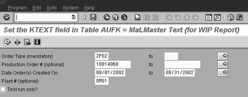 The program then looks for any PP orders in the AUFK table that still have a blank short text field (technical name is KTEXT). For those records, and only those records, the program finds a match in the PP module’s header table (i.e., AFKO) as a way to obtain the material master number.