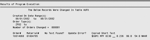 At that point, it becomes a simple programming task to use that material master number to look up a text in table MAKT and copy it into table AUFK. You also might want to put some "write" commands in the program at the end, as a way to show the end user which texts were copied to where. An example output is shown in Figure 4.