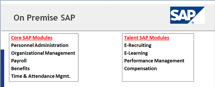 There is also quite a bit of confusion regarding duplication between on premise and SuccessFactors of some of the Talent solutions (like Recruiting) and the actual maturity and saturation of some of the SuccessFactors solutions. Here I will explain the differences of each, and what each system does.