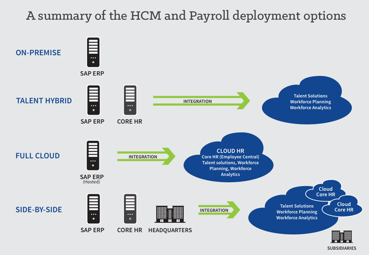 The third option, full cloud, means that the company has moved its core HR functionality (from SAP to SuccessFactors Employee Central), including its talent management functionality (recruitment, performance management, learning, succession planning, and so forth) into the cloud. This full-cloud solution can include the optional deployment of an SAP-hosted payroll option called SuccessFactors Employee Central Payroll. The SAP-hosted payroll option, in the previous sentence, is worth discussing in a bit more detail. SAP positions this full-cloud model, including Employee Central Payroll, as moving everything to the cloud and, indeed, a large amount is moved to the cloud. However, it is important to know that SuccessFactors Employee Central Payroll (often shown in the SAP’s model diagrams in a cloud shape) is actually just a hosted version of the SAP payroll solution. The configuration setup, installation, and so on, all happen exactly the same was as they do now in an on-premise SAP payroll system, via the IMG. The one difference is that instead of hosting payroll on your company server, SAP hosts it for you as a service. Employee Central Payroll is relatively new—of the approximately 25 licenses SuccessFactors has sold for their Employee Central Payroll, approximately six companies are using it to actively pay employees.