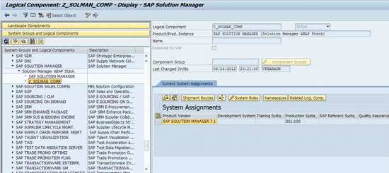 You can assign many system roles to Solution Manager logical components to support complex SAP product landscapes. The SAP system delivers a series of system role names, and you can augment these by creating your own names. The definition and setup of logical components is beyond the scope of this article, but Figure 11 shows the logical component definition for the Solution Manager system used in this article, shown in transaction SMSY.