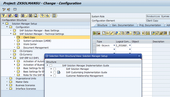 In the example in Figure 14, you see the IMG for the Solution Manager system because the Solution Manager logical component Z_SOLMAN_COMP is selected. Had you chosen a logical component defined for the SAP ERP system, then the IMG for SAP ERP would be displayed in the pop-up.