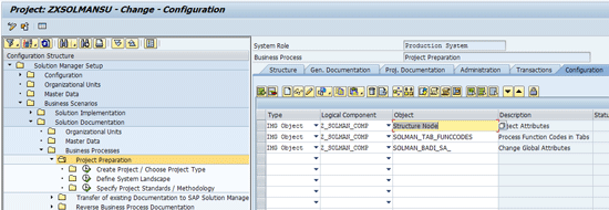 When it is time to do the actual configuration, you simply navigate to the appropriate node on the BPH structure. Select the Configuration tab and select the row that contains the configuration element (or IMG object) for the configuration you want to perform. Click the configure icon  to open the IMG in the satellite system at the exact point you need to perform the configuration. This eliminates the time-consuming, error-prone tree navigation associated with direct access to the IMG via transaction SPRO.