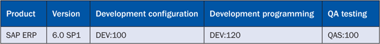 The second key concept is the system role. This combination of system ID (SID) and client is used for a specific purpose. In Table 1, the development system client 100 is used for configuration activities, while the development system client 120 is used for ABAP programming activities.