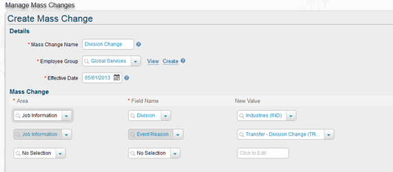 Figure 1 shows an example for a mass division change. Effective 05/01/2013, all employees who belong to the Global Services Division are moved to a new division named Industries (IND). Once this mass change transaction is completed, the Event Reason is listed as Transfer – Division Change (TRANF).