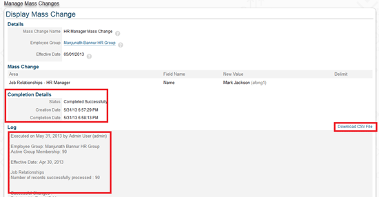 Click a name in the Mass Change Name column (Figure 10) to open the overview screen that shows the details on the status of the transaction (e.g., Status, Creation Date, and Completion Date), along with the log information that is sent in the email confirmation (Figure 11). You also have the option to download the file in .csv format (e.g., the Download CSV File link) to see the list of employees affected by this change.