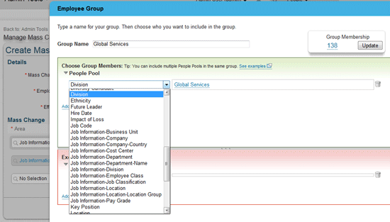 In my example I created the Global Services Division Group, which has 138 employees, as displayed in the Group Membership section (Figure 2). Once you run this mass change program for all 138 employees, the division changes from Global Services to Industries (IND) as per the example.