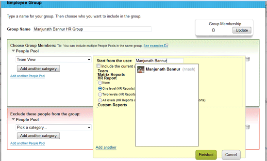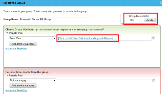 Once you make your selections and click the Done button, the system creates a People Pool that has Manjunath Bannur as its HR manager. If you click the Update button under Group Membership (at the top right), the system retrieves and shows the number of employees who have Manjunath Bannur listed as their HR manager (Figure 7).