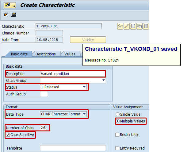 This class must contain not only the configurable product’s characteristics but also the reference characteristic (T_VKOND_01) that you created in the previous step that I explained in the “Create a Variant Characteristic” section. Click the save icon to save your data. The system then displays a message like the one shown in