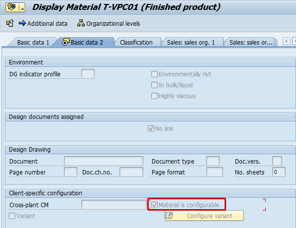In the standard system, the material type defined for configurable materials is KMAT, but it is also possible to use any material type as configurable material as long as the Material is configurable indicator has been selected. In my example, I have used a Halb material type (semifinished goods).