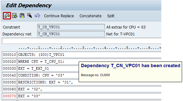 In the initial screen (not shown), enter the value T_CN_VPC01 as the dependency net, and then choose the option Basic data and enter the Description Net for T-VPC01, Dependency Group T-01, and Dependency Type Constraint and edit the constraint. Click the check icon to check the consistency of the instructions and click the save icon to save your data. The system displays a message like the one shown in