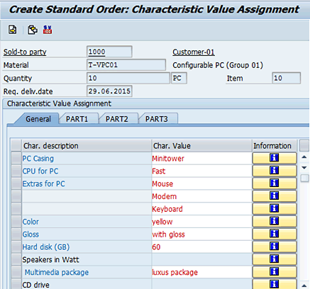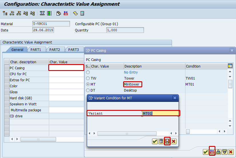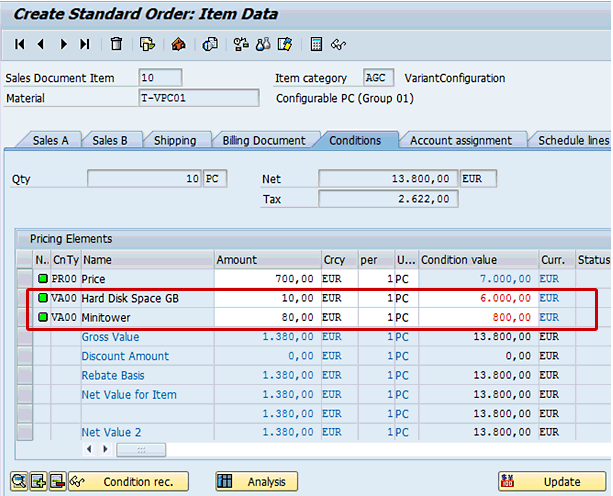 The sales department should be responsible for creating a variant condition. In my example, I use variant conditions that are based on 1GB01, for which each gigabyte (GB) of hard disk is priced at 10.00 euro. I also use the variant MT01, for which each minitower is priced at 80.00 euro, and the variant TW01, for which each tower is priced at 120.00 euro.