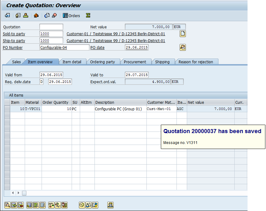 Figure 15). Check the consistency of the data and click the save icon to save the document. The system then displays the quotation document number as shown in