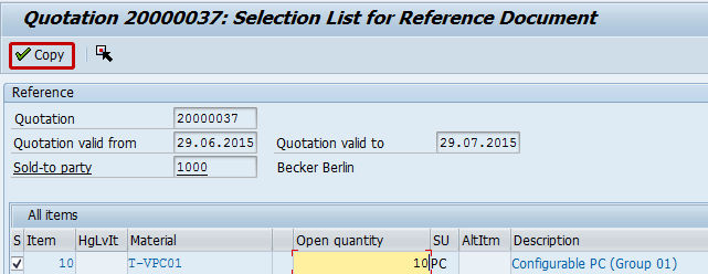 Figure 20, select the line item (i.e., click the box under the S column), verify the sales quantity, and then click the Copy button. The system then displays the details shown in