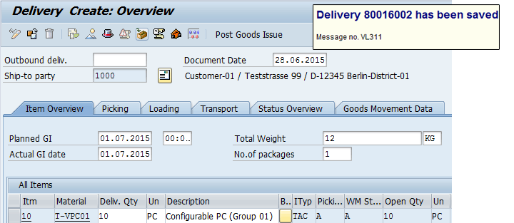 In this step, the warehouse organization creates an outbound delivery for the configurable products. To complete this step, execute transaction code VL01N or follow menu path Logistics > Logistics Execution > Outbound Process > Goods Issue for Outbound Delivery > Post Goods Issue > Outbound Delivery > Create > Single Document (