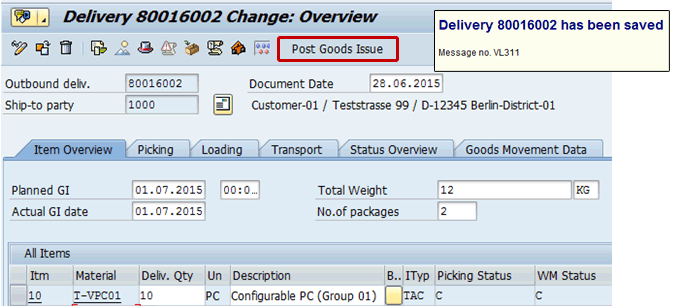 In this step, the warehouse organization performs a goods issue of configurable products. The goods issue can be done with reference to the outbound delivery by executing transaction code VL02N or following menu path Logistics > Logistics Execution > Outbound Process > Goods Issue for Outbound Delivery > Post Goods Issue > Outbound Delivery Single Document. Enter the Outbound deliv. (outbound delivery) document and press Enter (Figure 25). Press the option Post Goods Issue. The system displays a message like the one shown in Figure 25.
