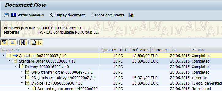 This step is optional and it is reported just to show that the complete sales cycle has been performed successfully, apart from the final customer’s payment. To display the sales document history created for your configurable products, execute transaction code VA03 or follow menu path Logistics > Sales and Distribution > Sales > Order > Display. In the initial screen that appears (not shown), enter the sales order document number and click the display document flow icon