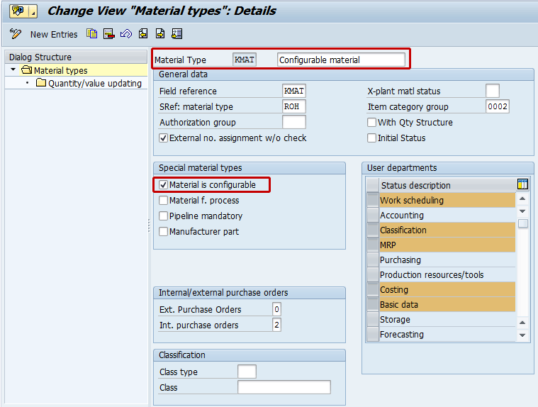 In the initial screen (not shown), select the material type KMAT and click the Details button or double-click the line item. The system displays the details shown in