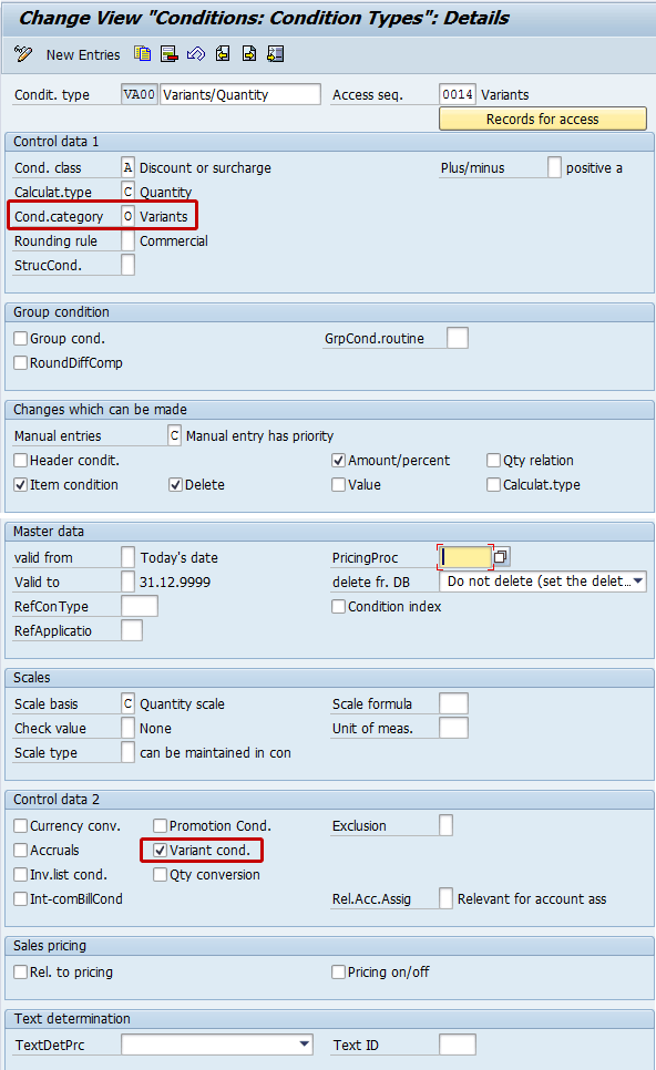 In the standard system, the condition types used to manage the variants of the configurable products are VA00 and VA01, used respectively to define the quantity and percentage values.