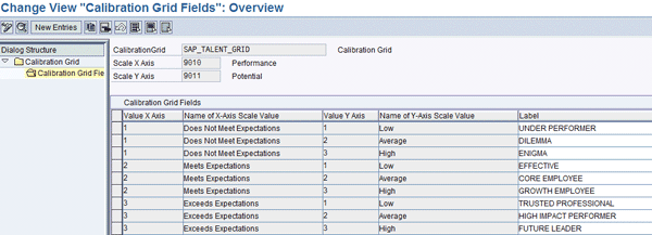 To configure the calibration grid follow IMG menu path to SAP IMG > Talent Management and Talent Development > Calibration Grid. Perform the following customizing activities: