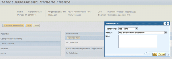 During talent assessments, managers nominate employees to a specific talent group (Figure 8) and the talent management specialist approves it. The manager can nominate an employee to multiple talent groups. By default, the system automatically nominates the person who created the talent group as a member of the support team.