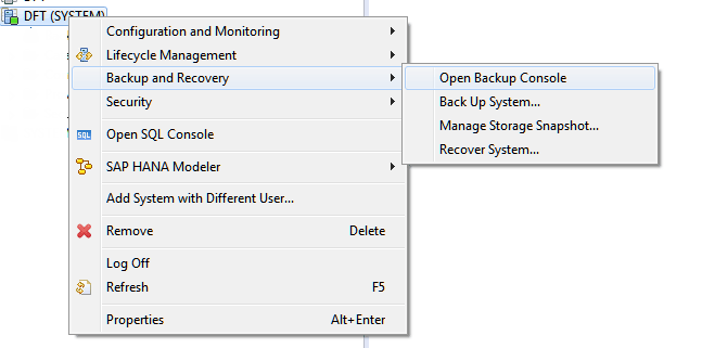 To access the backup console, right-click your system in SAP HANA studio. Choose Backup and Recovery from the pop-up menu in Figure 5 and then click the Open Backup Console option.