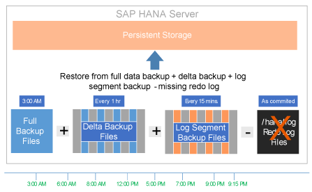 For complete point-in-time recovery, a data backup set, a log-segment backup set, and the standard redo logs are all required. If the redo logs are not available, the system can only be recovered to the latest log-segment or delta backup. As you recall, log-segment backups are automatically initiated every 15 minutes by default. Therefore, if your logging partition or logging files are not available, you can lose up to 15 minutes of committed transactions based on the default settings. Fortunately, this would only be an issue if the log partition /hana/log or the files within were completely lost due to a hardware failure.